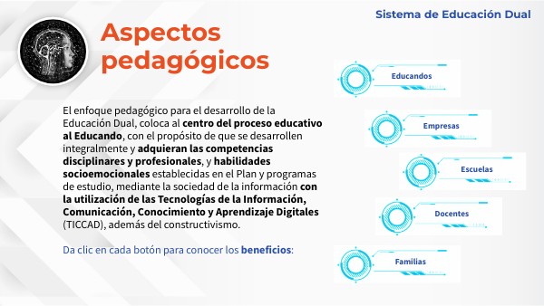 El enfoque pedagógico para el desarrollo de la Educación Dual, coloca al centro del proceso educativo al Educando, con el propósito de que se desarrollen integralmente y adquieran las competencias disciplinares y profesionales, y habilidades socioemocionales establecidas en el Plan y programas de estudio, mediante la sociedad de la información con la utilización de las Tecnologías de la Información, Comunicación, Conocimiento y Aprendizaje Digitales (TICCAD), además del constructivismo. Da clic en cada botón para conocer los beneficios: