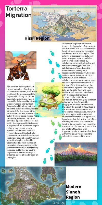 The eruption at Firespit Island caused a number of ecological disasters from ashfall, such as the tainting of the waterways of the region, which likely cut off the essential nutrients and metals needed for Pokémon like Hisuian Sliggoo, Goodra and Qwilfish, Overqwil and Ursaluna to thrive, while the ashfall also likely created climatic shifts that forced other Hisuian variants and humans alike out of their ecological niches. At the same time, however, the ashfall served as a potent fertilizer for the soil in the region and is likely what is responsible for the Sinnoh region being so much more heavily forested compared to the Hisui region. Likewise, this also broke down environmental obstacles that kept many populations of Pokémon in the Hisui region isolated in specific habitats from the rest of the region, allowing creatures like the members of the Turtwig family to spread out farther across the region to exude their ecological influence across a broader span of the region.
