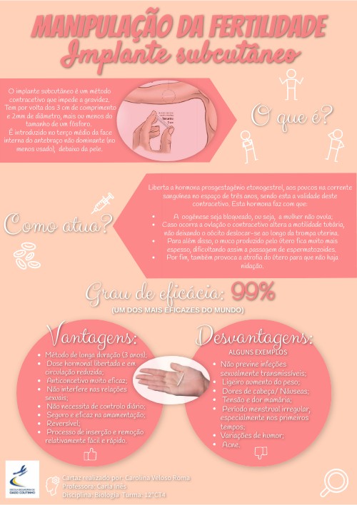 O implante subcutâneo é um método contracetivo que impede a gravidez. Tem por volta dos 3 cm de comprimento e 2mm de diâmetro, mais ou menos do tamanho de um fósforo. É introduzido no terço médio da face interna do antebraço não dominante (no menos usado), debaixo da pele.