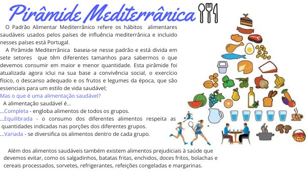 O Padrão Alimentar Mediterrânico refere os hábitos alimentares saudáveis usados pelos países de influência mediterrânica e incluido nesses países está Portugal. A Pirâmide Mediterrânica baseia-se nesse padrão e está divida em sete setores que têm diferentes tamanhos para sabermos o que devemos consumir em maior e menor quantidade. Esta pirâmide foi atualizada agora iclui na sua base a convivência social, o exercício físico, o descanso adequado e os frutos e legumes da época, que são essenciais para um estilo de vida saudável;