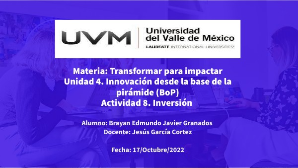 Materia: Transformar para impactar Unidad 4. Innovación desde la base de la pirámide (BoP) Actividad 8. Inversión