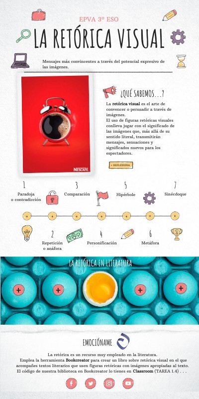 La retórica es un recurso muy empleado en la literatura. Emplea la herramienta Bookcreator para crear un libro sobre retórica visual en el que acompañes textos literarios que usen figuras retóricas con imágenes apropiadas al texto. El código de nuestra biblioteca en Bookcreator lo tienes en Classroom (TAREA 1.4) . . .
