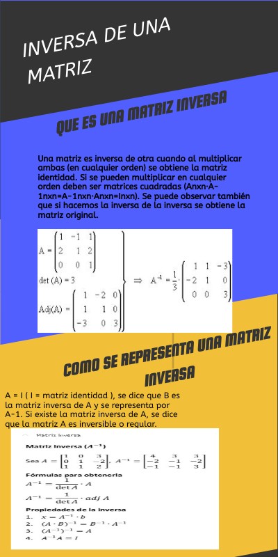 Una matriz es inversa de otra cuando al multiplicar ambas (en cualquier orden) se obtiene la matriz identidad. Si se pueden multiplicar en cualquier orden deben ser matrices cuadradas (Anxn·A-1nxn=A-1nxn·Anxn=Inxn). Se puede observar también que si hacemos la inversa de la inversa se obtiene la matriz original.