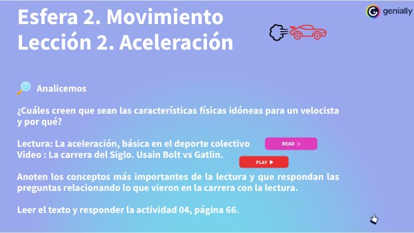 Analicemos ¿Cuáles creen que sean las características físicas idóneas para un velocista y por qué? Lectura: La aceleración, básica en el deporte colectivo Video : La carrera del Siglo. Usain Bolt vs Gatlin. Anoten los conceptos más importantes de la lectura y que respondan las preguntas relacionando lo que vieron en la carrera con la lectura. Leer el texto y responder la actividad 04, página 66.
