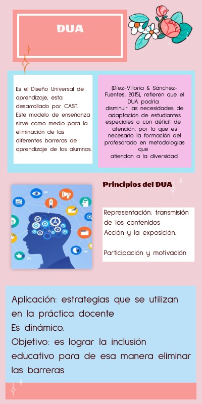 (Díez-Villoria & Sánchez-Fuentes, 2015), refieren que el DUA podría disminuir las necesidades de adaptación de estudiantes especiales o con déficit de atención, por lo que es necesario la formación del profesorado en metodologías que atiendan a la diversidad.