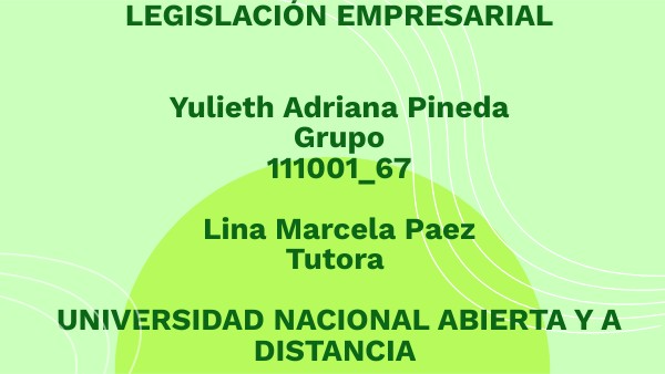 LEGISLACIÓN EMPRESARIAL Yulieth Adriana Pineda Grupo 111001_67 Lina Marcela Paez Tutora UNIVERSIDAD NACIONAL ABIERTA Y A DISTANCIA