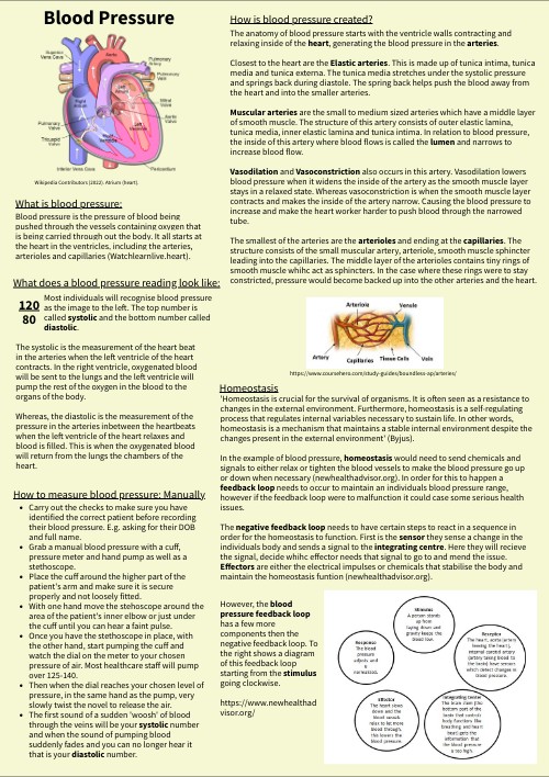 The anatomy of blood pressure starts with the ventricle walls contracting and relaxing inside of the heart, generating the blood pressure in the arteries. Closest to the heart are the Elastic arteries. This is made up of tunica intima, tunica media and tunica externa. The tunica media stretches under the systolic pressure and springs back during diastole. The spring back helps push the blood away from the heart and into the smaller arteries. Muscular arteries are the small to medium sized arteries which have a middle layer of smooth muscle. The structure of this artery consists of outer elastic lamina, tunica media, inner elastic lamina and tunica intima. In relation to blood pressure, the inside of this artery where blood flows is called the lumen and narrows to increase blood flow. Vasodilation and Vasoconstriction also occurs in this artery. Vasodilation lowers blood pressure when it widens the inside of the artery as the smooth muscle layer stays in a relaxed state. Whereas vasoconstriction is when the smooth muscle layer contracts and makes the inside of the artery narrow. Causing the blood pressure to increase and make the heart worker harder to push blood through the narrowed tube. The smallest of the arteries are the arterioles and ending at the capillaries. The structure consists of the small muscular artery, arteriole, smooth muscle sphincter leading into the capillaries. The middle layer of the arterioles contains tiny rings of smooth muscle whihc act as sphincters. In the case where these rings were to stay constricted, pressure would become backed up into the other arteries and the heart.