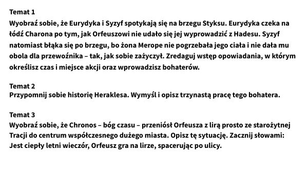 Temat 1Wyobraź sobie, że Eurydyka i Syzyf spotykają się na brzegu Styksu. Eurydyka czeka na łódź Charona po tym, jak Orfeuszowi nie udało się jej wyprowadzić z Hadesu. Syzyf natomiast błąka się po brzegu, bo żona Merope nie pogrzebała jego ciała i nie dała mu obola dla przewoźnika – tak, jak sobie zażyczył. Zredaguj wstęp opowiadania, w którym określisz czas i miejsce akcji oraz wprowadzisz bohaterów.