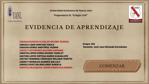2088828 BURGOS ELIZALDE SELENE YESENIA 2088162 CANO SANCHEZ PAOLA 2089240 GÓMEZ MARTÍNEZ YAZMIN 2089177 GUTIERREZ AGUIRRE MARIANA 2088738 LOPEZ DORIA DEVANY YAMILET 2087598 LOPEZ ORTEGA KAREN GUADALUPE 2087627 MIRANDA CERECEDO MELANIE YARETSI 2088677 MORALES ALVAREZ NALLELY 2089513 RUIZ SALINAS ANDY DANIELA 2089762 VELAZQUEZ JAVIER EDWIN ALEJANDRO