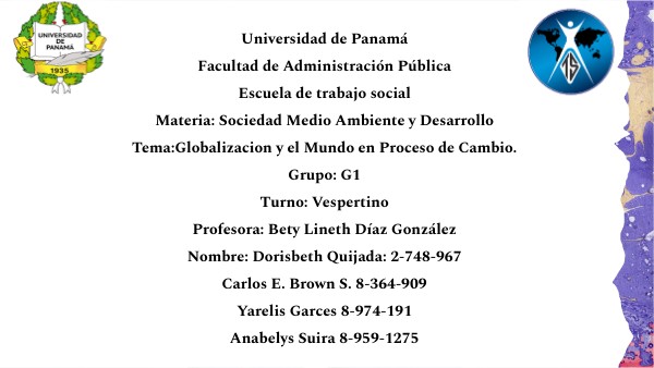 Universidad de Panamá Facultad de Administración Pública Escuela de trabajo social Materia: Sociedad Medio Ambiente y Desarrollo Tema:Globalizacion y el Mundo en Proceso de Cambio. Grupo: G1 Turno: Vespertino Profesora: Bety Lineth Díaz González Nombre: Dorisbeth Quijada: 2-748-967 Carlos E. Brown S. 8-364-909 Yarelis Garces 8-974-191 Anabelys Suira 8-959-1275