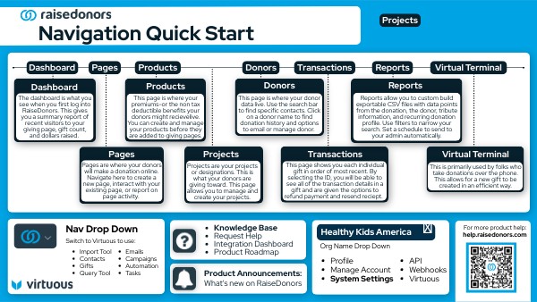 Pages are where your donors will make a donation online. Navigate here to create a new page, interact with your existing page, or report on page activity.