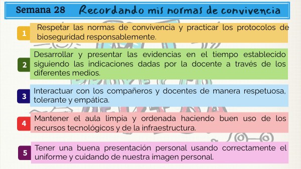 Respetar las normas de convivencia y practicar los protocolos de bioseguridad responsablemente.