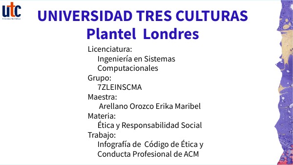 Licenciatura:Ingeniería en Sistemas Computacionales Grupo: 7ZLEINSCMA Maestra: Arellano Orozco Erika Maribel Materia: Ética y Responsabilidad Social Trabajo:Infografía de Código de Ética y Conducta Profesional de ACM