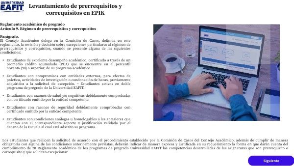 Los estudiantes que realicen la solicitud de acuerdo con el procedimiento establecido por la Comisión de Casos del Consejo Académico, además de cumplir de manera obligatoria con alguna de las condiciones anteriormente previstas, deberán indicar de manera expresa y justificada en su requerimiento la forma en que darán cuenta del cumplimiento de 20 Reglamento académico de los programas de pregrado Universidad EAFIT las competencias desarrolladas de las asignaturas que son prerrequisito o correquisito y que solicitan excepcionar.