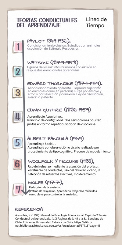 Arancibia, V. (1997). Manual de Psicología Educacional. Capítulo 2 Teoría Conductual del Aprendizaje. (s.f.) Paginas de la 45 a la 81. Santiago de Chile: Ediciones Universidad Católica de Chile. https://elibro-net.bibliotecavirtual.unad.edu.co/es/ereader/unad/67715?page=45