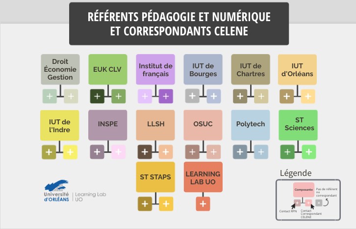 Cartographie des référents pédagogie et numérique, et correspondants CELENE réalisée par le Learning Lab Université Orléans https://www.univ-orleans.fr/fr/learninglab-uo