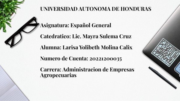 UNIVERSIDAD AUTONOMA DE HONDURAS Asignatura: Español General Catedratico: Lic. Mayra Sulema Cruz Alumna: Larisa Yolibeth Molina Calix Numero de Cuenta: 20221200035 Carrera: Administracion de Empresas Agropecuarias