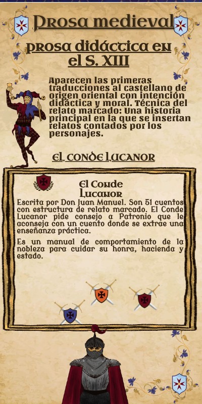 Escrita por Don Juan Manuel. Son 51 cuentos con estructura de relato marcado. El Conde Lucanor pide consejo a Patronio que le aconseja con un cuento donde se extrae una enseñanza práctica.Es un manual de comportamiento de la nobleza para cuidar su honra, hacienda y estado.