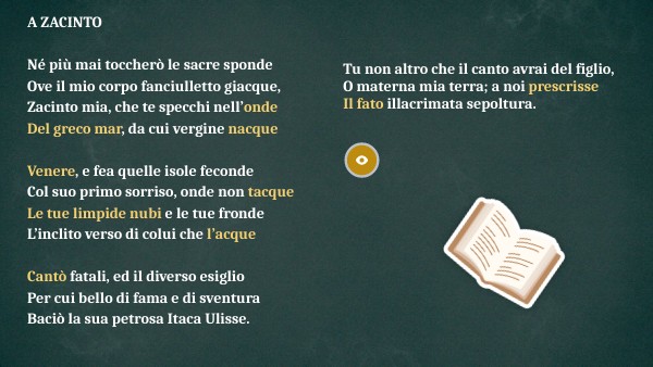 A ZACINTO Né più mai toccherò le sacre sponde Ove il mio corpo fanciulletto giacque, Zacinto mia, che te specchi nell’onde Del greco mar, da cui vergine nacque Venere, e fea quelle isole feconde Col suo primo sorriso, onde non tacque Le tue limpide nubi e le tue fronde L’inclito verso di colui che l’acque Cantò fatali, ed il diverso esiglio Per cui bello di fama e di sventura Baciò la sua petrosa Itaca Ulisse.