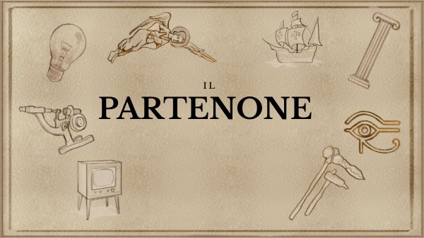 Il Partenone, costruito in marmo pentelico, è un tempio greco periptero octastilo di ordine dorico. Il tempio segue il canone del rettangolo aureo ed è decorato con sculture in altorilievo, a cura di Fidia (490-430 a.C.), che raffigurano storie mitologiche, nel fregio esterno, e temi civici, nel fregio interno.