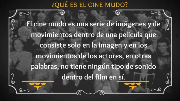 El cine mudo es una serie de imágenes y de movimientos dentro de una película que consiste solo en la imagen y en los movimientos de los actores, en otras palabras, no tiene ningún tipo de sonido dentro del film en sí.