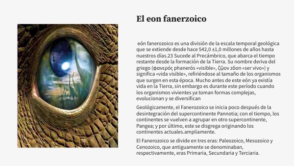 eón fanerozoico es una división de la escala temporal geológica que se extiende desde hace 542,0 ±1,0 millones de años hasta nuestros días.23 Sucede al Precámbrico, que abarca el tiempo restante desde la formación de la Tierra. Su nombre deriva del griego (φανερός phanerós «visible», ζῷον zôon «ser vivo») y significa «vida visible», refiriéndose al tamaño de los organismos que surgen en esta época. Mucho antes de este eón ya existía vida en la Tierra, sin embargo es durante este período cuando los organismos vivientes ya toman formas complejas, evolucionan y se diversificanGeológicamente, el Fanerozoico se inicia poco después de la desintegración del supercontinente Pannotia; con el tiempo, los continentes se vuelven a agrupar en otro supercontinente, Pangea; y por último, este se disgrega originando los continentes actuales.ampliamente. El Fanerozoico se divide en tres eras: Paleozoico, Mesozoico y Cenozoico, que antiguamente se denominaban, respectivamente, eras Primaria, Secundaria y Terciaria.