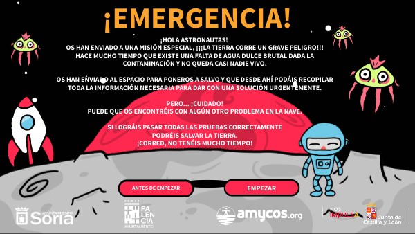 ¡hola astronautas! os han enviado a una misión especial, ¡¡¡la tierra corre un grave peligro!!! hace mucho tiempo que existe una falta de agua dulce brutal dada la contaminación y no queda casi nadie vivo. os han enviado al espacio para poneros a salvo y que desde ahí podáis recopilar toda la información necesaria para dar con una solución urgentemente. pero... ¡cuidado! puede que os encontréis con algÚn otro problema en la nave. si lográis pasar todas las pruebas correctamente podréis salvar la tierra. ¡corred, no tenéis mucho tiempo!