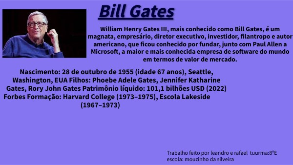 William Henry Gates III, mais conhecido como Bill Gates, é um magnata, empresário, diretor executivo, investidor, filantropo e autor americano, que ficou conhecido por fundar, junto com Paul Allen a Microsoft, a maior e mais conhecida empresa de software do mundo em termos de valor de mercado.