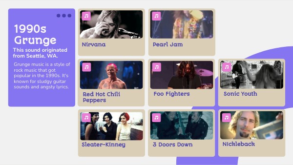 Grunge music is a style of rock music that got popular in the 1990s. It's known for sludgy guitar sounds and angsty lyrics.
