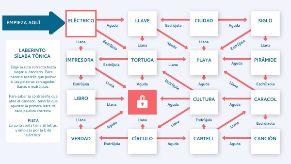 Elige la ruta correcta hasta llegar al candado. Para hacerlo tendrás que pensar si las palabras son agudas, llanas o esdrújulas.Para saber la contraseña que abre el candado, tendrás que apuntar la primera letra de cada palabra correcta. PISTA La contraseña tiene 10 letras, y empieza por la E de "eléctrico".