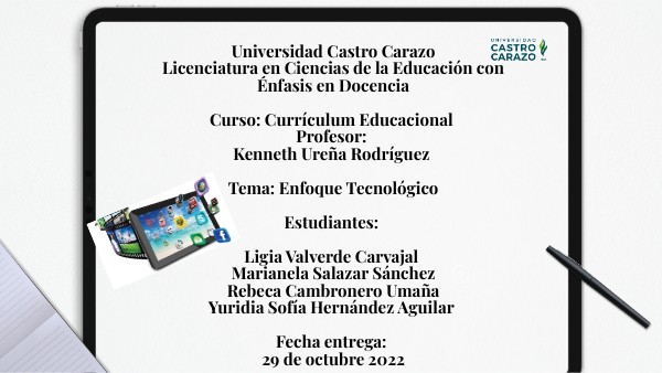Universidad Castro Carazo Licenciatura en Ciencias de la Educación con Énfasis en Docencia Curso: Currículum Educacional Profesor: Kenneth Ureña Rodríguez Tema: Enfoque Tecnológico Estudiantes: Ligia Valverde Carvajal Marianela Salazar Sánchez Rebeca Cambronero Umaña Yuridia Sofía Hernández Aguilar Fecha entrega: 29 de octubre 2022