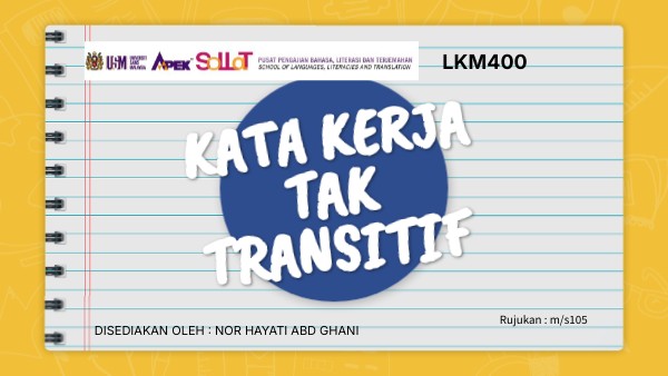Definisi : Kata Kerja Tak Transitif ialah kata kerja yang tidak memerlukan objek untuk melengkapkan maksud ayat tersebut. Contoh perkataan “ tidur”.