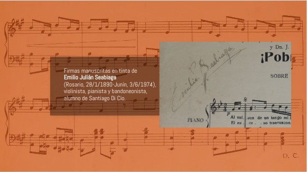 Firmas manuscritas en tinta deEmilio Julián Seabiaga(Rosario, 28/1/1890-Junín, 3/6/1974), violinista, pianista y bandoneonista, alumno de Santiago Di Cío.