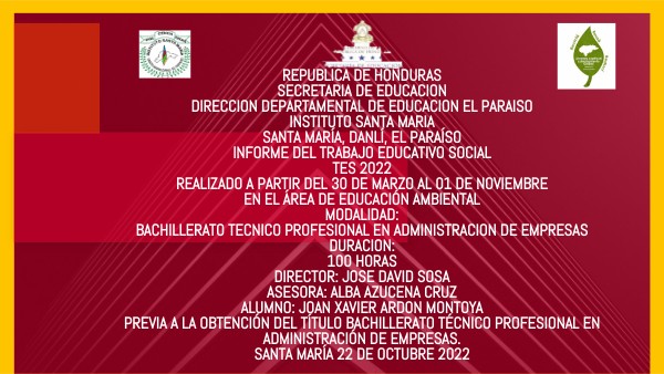 REPUBLICA DE HONDURAS SECRETARIA DE EDUCACION DIRECCION DEPARTAMENTAL DE EDUCACION EL PARAISO INSTITUTO SANTA MARIA Santa María, Danlí, El Paraíso Informe del Trabajo Educativo Social TES 2022 Realizado a partir del 30 de marzo al 01 de noviembre En el área de Educación Ambiental MODALIDAD: BACHILLERATO TECNICO PROFESIONAL EN ADMINISTRACION DE EMPRESAS DURACION: 100 HORAS DIRECTOR: JOSE DAVID SOSA ASESORA: ALBA AZUCENA CRUZ ALUMNO: JOAN XAVIER ARDON MONTOYA Previa a la obtención del título bachillerato técnico profesional en administración de empresas. Santa María 22 de octubre 2022