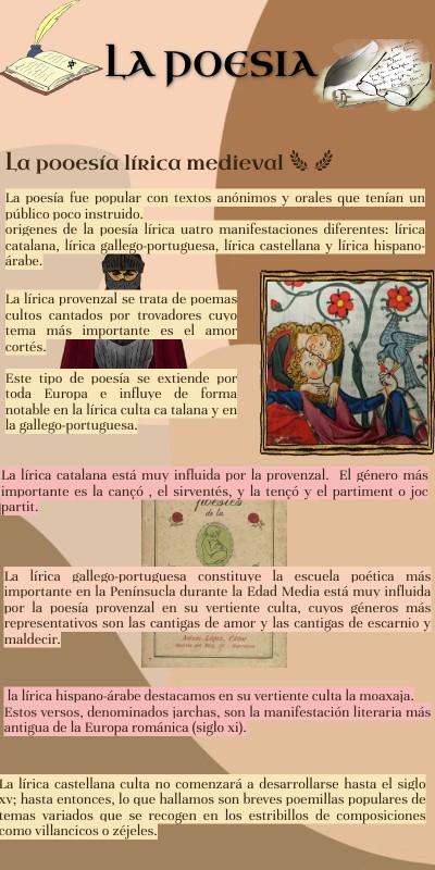 La poesía fue popular con textos anónimos y orales que tenían un público poco instruido. origenes de la poesía lírica uatro manifestaciones diferentes: lírica catalana, lírica gallego-portuguesa, lírica castellana y lírica hispano-árabe.