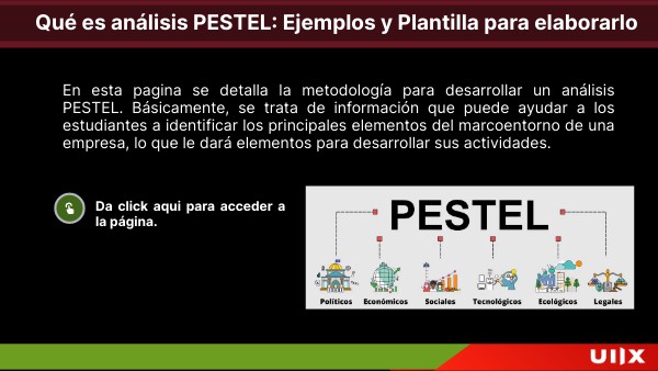 En esta pagina se detalla la metodología para desarrollar un análisis PESTEL. Básicamente, se trata de información que puede ayudar a los estudiantes a identificar los principales elementos del marcoentorno de una empresa, lo que le dará elementos para desarrollar sus actividades.