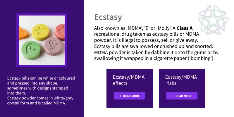 Also known as 'MDMA', 'E' or 'Molly'. A Class A recreational drug taken as ecstasy pills or MDMA powder. It is illegal to possess, sell or give away.