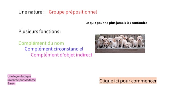 Avant de commencer les questions du Quiz, tu vas donc avoir 4 rappels de leçon sur : - une nature grammaticale : le groupe prépostionnel (G.P) - trois fonctions grammaticales: complément du nom ( C.D.N) complément circonstanciel ( C.C) et complément d'objet indirect (C.O.I)