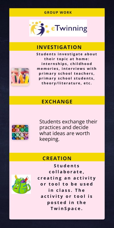 Students investigate about their topic at home: internships, childhood memories, interviews with primary school teachers, primary school students, scientific literature, etc.