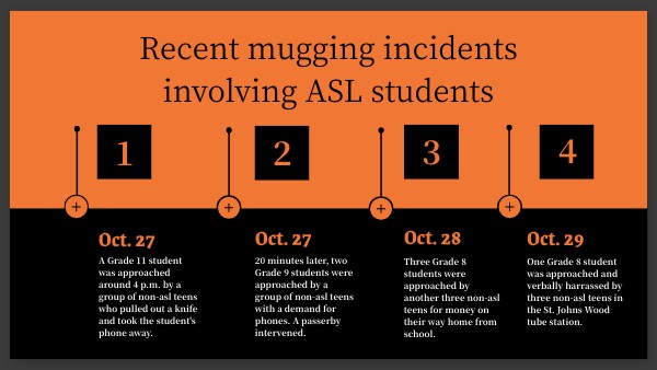 20 minutes later, two Grade 9 students were approached by a group of non-asl teens with a demand for phones. A passerby intervened.