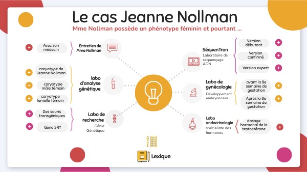 Génotype = Ensemble des gènes/allèles d’un individu. Phénotype = Ensemble des caractères d’un individu, observables à différentes échelles (moléculaire, cellulaire et macroscopique). Gène = séquence précise de nucléotides de l’ADN codant la synthèse d’une molécule intervenant dans l’expression d’un caractère. Hormone = molécule produite par un organe, transportée par le sang, et modifiant à distance le fonctionnement d’organes/tissus/cellules. Mutation = modification de la séquence nucléotidique d’un gène. Dans le cas du gène SRY, la mutation sur un gène le rend inefficace.