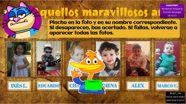 Pincha en la foto y en su nombre correspondiente. Si desaparecen, has acertado. Si fallas, volveran a aparecer todas las fotos.