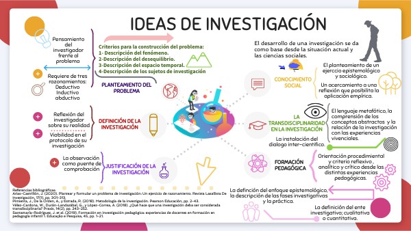Referencias bibliográficas: Arias-Castrillón, J. (2020). Plantear y formular un problema de investigación: Un ejercicio de razonamiento. Revista Lasallista De Investigación, 17(1), pp. 301-313. Pimienta, J., De la Orden, A., y Estrada, R. (2018). Metodología de la investigación. Pearson Educación, pp. 2-43. Vélez-Cardona, W., Durán-Landazábal, G., y López-Correa, A. (2018). ¿Qué hace que una investigación deba ser considerada transdisciplinaria? Praxis, 14(2), pp. 243-252. Santamaría-Rodríguez, J. et al. (2019). Formación en investigación pedagógica: experiencias de docentes en formación en pedagogía infantil 1. Educação e Pesquisa, 45, pp. 1-21.