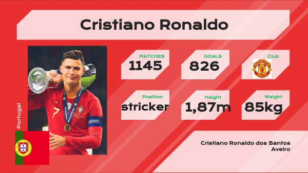 Cristiano Ronaldo dos Santos Aveiro was born on February 5, 1985 in Funchal, Portugal. He is a Portuguese footballer who plays as a left winger or striker.He currently plays for Manchester United and the Portuguese national team, where he is captain. He is the player with most goals in the history of football in official matches, being simultaneously the player with most goals in the history of national teams, as well as at club level.