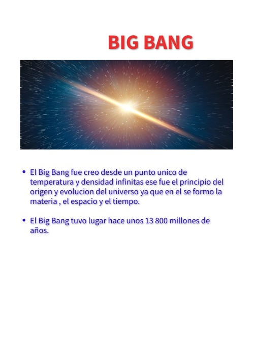 - El Big Bang fue creo desde un punto unico de temperatura y densidad infinitas ese fue el principio del origen y evolucion del universo ya que en el se formo la materia , el espacio y el tiempo.