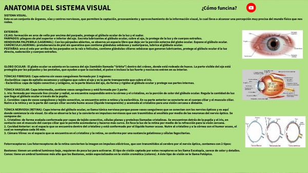 GLOBO OCULAR: El globo ocular se asienta en la cuenca del ojo (también llamada "órbita") dentro del cráneo, donde está rodeado de hueso. La parte visible del ojo está protegida por los párpados y las pestañas, que ayudan a que la suciedad, el polvo e incluso la luz fuerte y nociva no entren en su interior. TÚNICAS FIBROSAS: Capa externa sin vasos sanguíneos formada por 2 regiones: -Esclerótica: capa de epitelio escamoso y colágeno que cubre al ojo y es la parte transparente que cubre el iris. - Esclerótica: capa de tejido conectivo y colágeno, es la parte blanca del ojo, da forma y rigidez al glóbulo ocular y protege sus partes internas. TÚNICA VASCULAR: Capa intermedia, contiene vasos sanguíneos y está formada por 3 parte: 1. Iris: formado por musculo liso circular y radial, se encuentra suspendido entre la córnea y el cristalino, es la porción de color del glóbulo ocular. Regula la cantidad de luz que llega al glóbulo ocular a través de la pupila. 2. Coroides: capa de vasos sanguíneos y tejido conectivo, se encuentra entre a retina y la esclerótica. En su parte anterior se convierte en el cuerpo ciliar y el musculo ciliar. Nutre a la retina y en la parte del cuerpo ciliar secreta humo acuso (líquido transparente) y acomoda al cristalino para una visión cercana o distante. TÚNICA NERVIOSA (RETINA): Capa interna del glóbulo ocular, se llama túnica nerviosa porque posee vasos sanguíneos que se conectan con los nervios ópticos y es aquí donde comienza la vía visual. En ella se observa la luz y la convierte en impulsos nerviosos que son trasmitidos al encéfalo por medio de las neuronas del nervio óptico. Se compone de: 1. Cristalino: de forma ovalada conformada por capas de tejido conectivo, células planas y proteínas llamadas cristalinas. Se encuentran detrás de la pupila y el iris, en contacto con el musculo del cuerpo ciliar que le permite acomodarse y hacerse más curvo. En foca la luz de la retina por medio de la refracción para la visón cercana. 2. Cavidad Anterior: es el espacio que se encuentra dentro del cristalino y está conformado por el líquido humor acuso. Nutre al cristalino y a la córnea con el humor acuso, el cual se reemplaza cada 90 min. 3. Cámara Vítrea: es el espacio que se encuentra en el cristalino y la retina, se conforma por una sustancia gelatinosa y células fagocitarias.