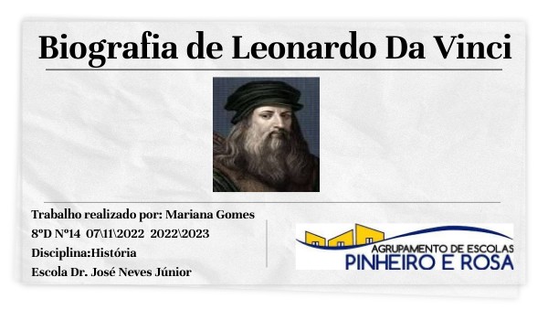 O tema que eu vou apresentar neste trabalho é sobre a biografia de Leonardo da vinci.Realizei este trabalho pois foi o tema que mais me interessou, uma vez que gostava de saber mais sobre a vida e as obras de Leonardo da Vinci.