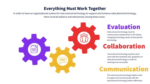 In order to have an organizational system for instructional technology to support and enhance educational technology, there must be balance and interactivity among these areas.