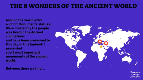 Around the world exista lot of: Monuments,statues... Were created by the people was lived in the Ancient civilitations and have been preverved to this day,in this lapbook I presented you 8 most important monuments of the ancient world. Between there we find...
