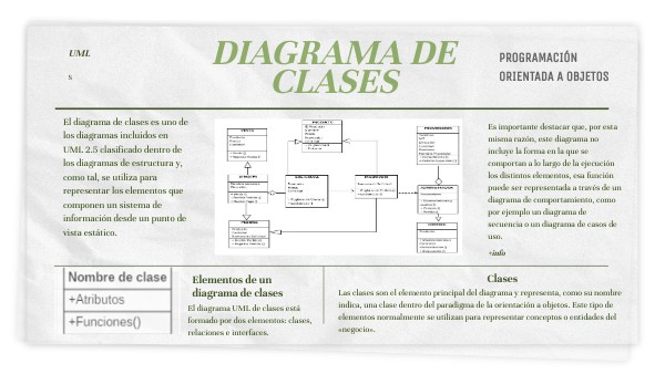 El diagrama de clases es uno de los diagramas incluidos en UML 2.5 clasificado dentro de los diagramas de estructura y, como tal, se utiliza para representar los elementos que componen un sistema de información desde un punto de vista estático.